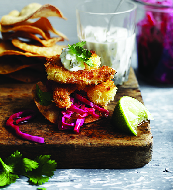 Coconut-Crumbed Prawn Tostada and Jalapeno Cream