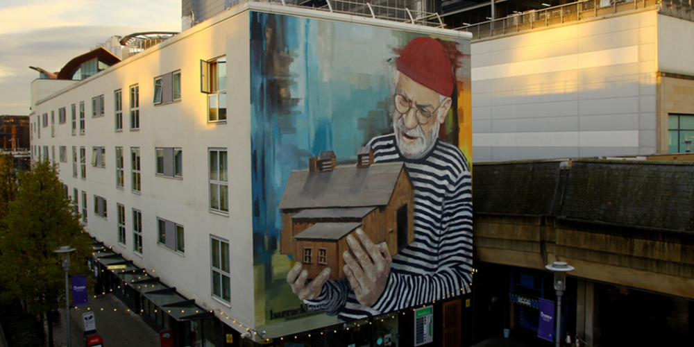 Wasp Elder is a socially engaged UK artist whose aim is to paint murals that communicate varying levels of history and social-poetics with people and in place. He often paints pictures populated by figures and unstressed backgrounds, enticing a sentiment of an obscure journey. His paintings present an evocative combination of solitary figures, collaged scenes, close-ups and obscured features.