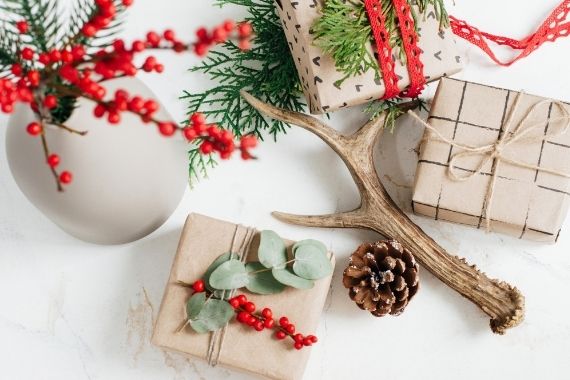 Brown paper packages tied up with string don’t have to be boring. Use plant and flower clippings, pinecones, berries, and foliage from your garden to add that festive touch and cut down on single use bows and ribbon. You can even add herbs like rosemary or cinnamon sticks and cloves.