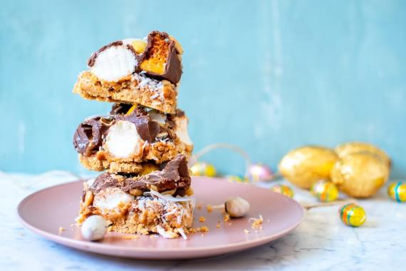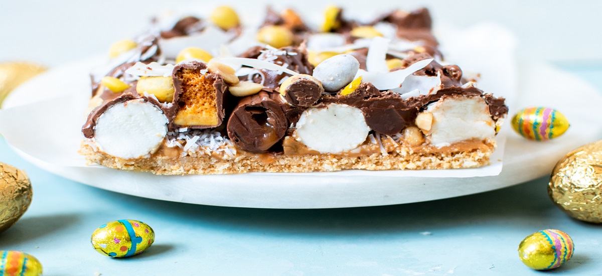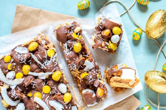 5. Place milk chocolate in a heatproof bowl. Microwave in 10 second intervals, stirring in between until melted and smooth. Pour melted chocolate over slice. Sprinkle with assorted Easter eggs and coconut flakes