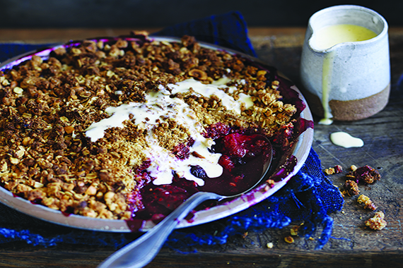 5. Pour the crumble mixture onto a baking tray and bake in the oven for 10 minutes, giving the crumble a little stir after 5 minutes. Remove from the oven, sprinkle the crumble over the fruit, then return to the oven for 25 minutes until the crumble is golden brown. Allow to rest for at least 10 minutes.