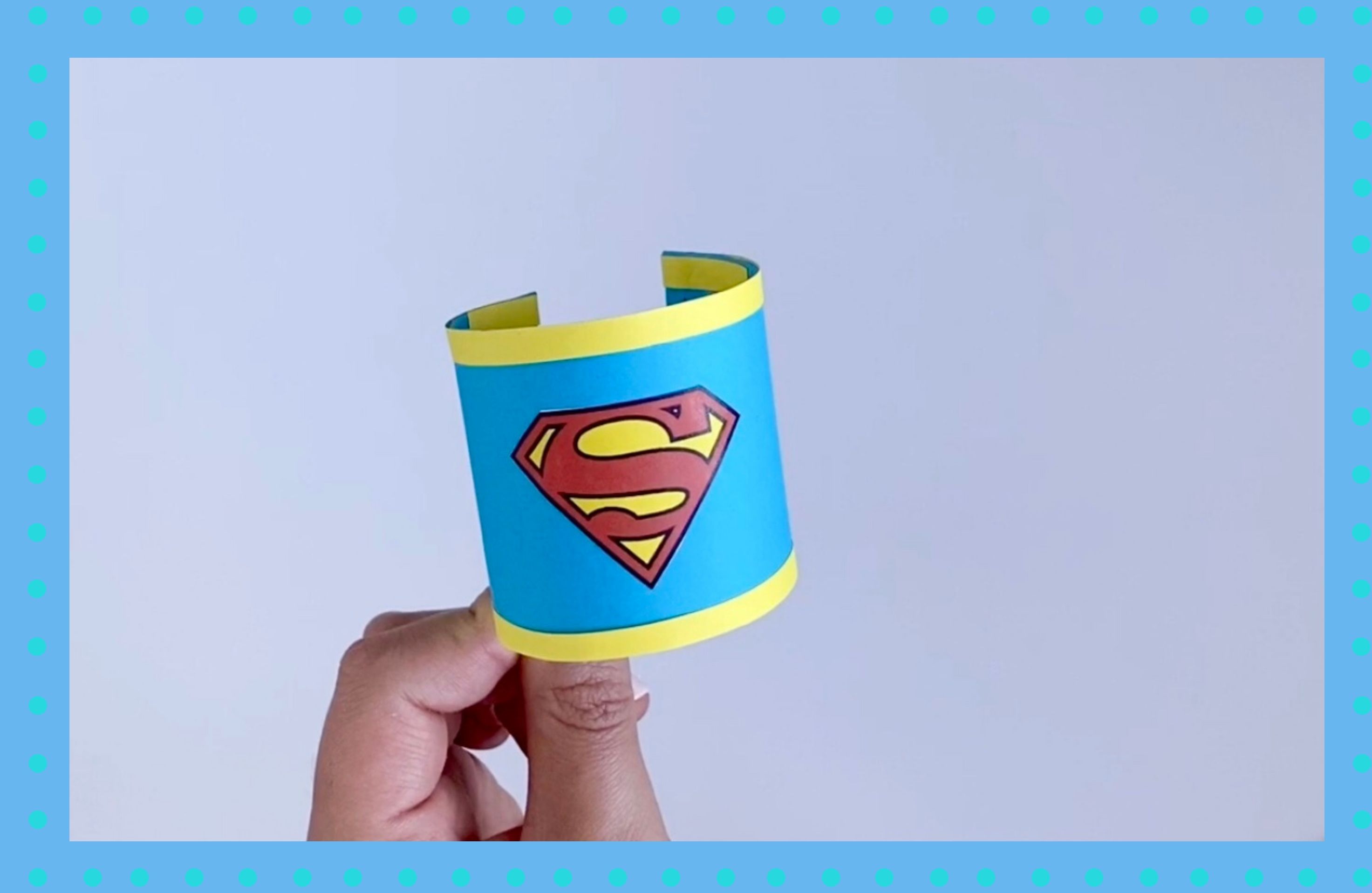 Cut out enough coloured cardboard to wrap each cuff and then glue in place. Choose a contrasting colour and cut two thinner strips. Glue to the top and bottom of the cuff. Select your preferred Superhero logo from our template and glue it to the centre of the cuff.